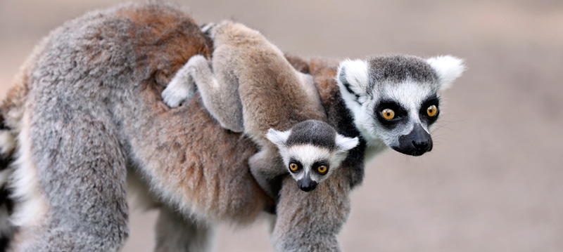 ¡Y no nos olvidemos de los lémures bebés! Las mamás se entregan al máximo y dedican todos sus cuidados y atenciones a sus bebés hasta que éstos desarrollan cierta autonomía. Las hembras catta que acaban de tener crías, las transportan sujetas en el pecho durante las 3 primeras semanas. Tras este periodo, las cargan a su espalda hasta que los bebés empiezan a ingerir alimento sólido. De esta manera, consiguen prestar todas las atenciones que los recién nacidos requieren sin descuidar su integración con el resto del grupo social.
